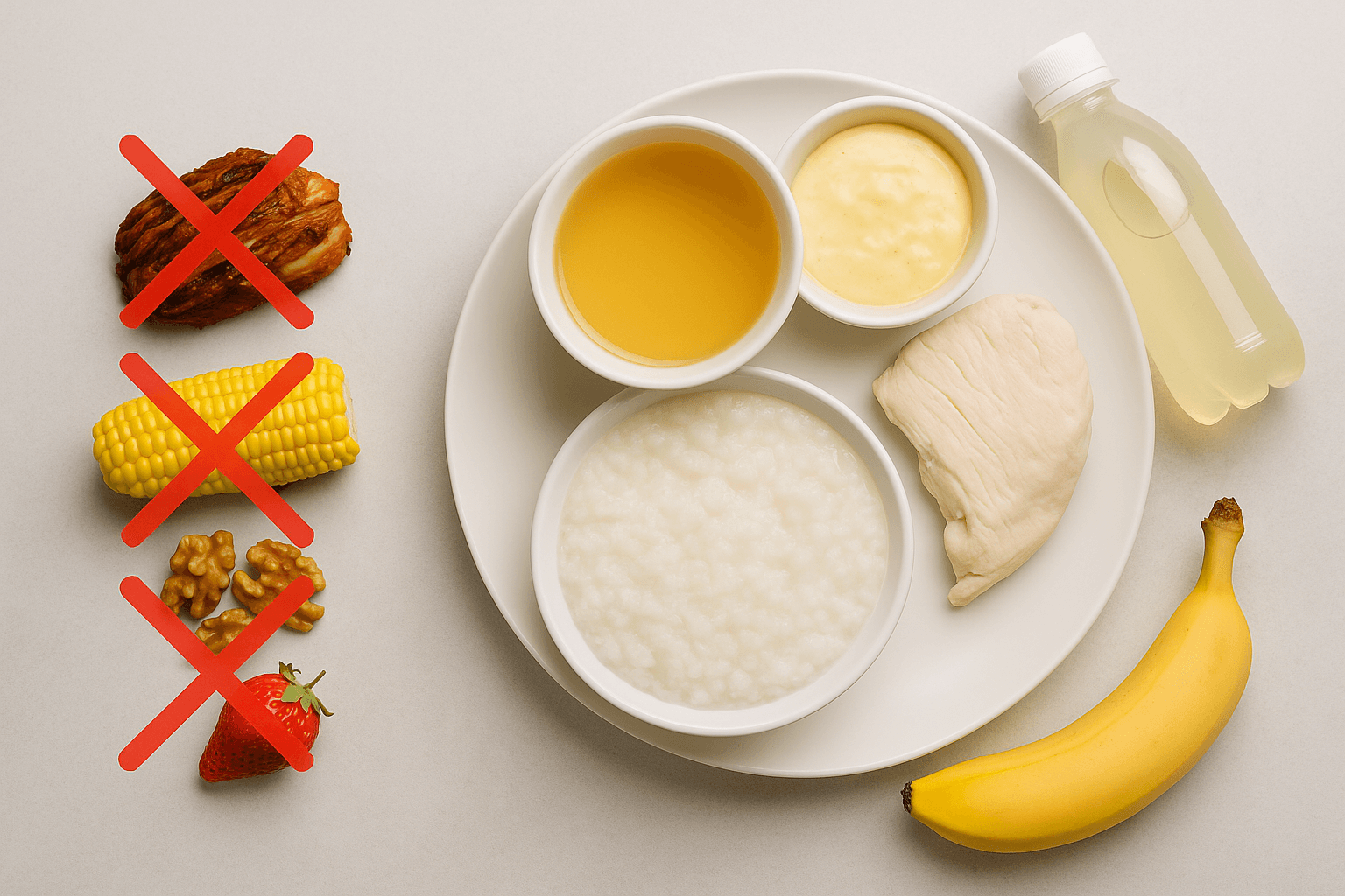 흰밥, 흰죽, 쌀미음, 계란찜, 맑은 국(무, 소고기, 다시마X), 두부, 닭가슴살(기름기 없이 삶은 것), 흰 생선살, 삶은 감자(껍질 없이 소량) - 음료: